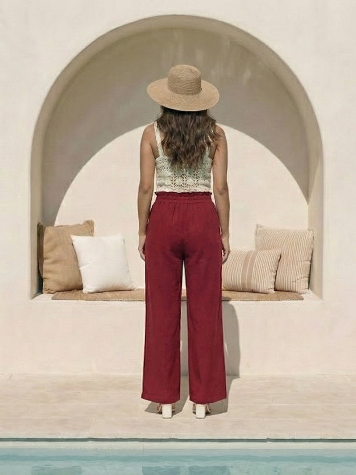 Crafted from a premium, breathable linen blend, they feature a signature high-rise paperbag waist with a ruffle detail and adjustable tie-belt. This design not only cinches the waist for a flattering hourglass silhouette but also offers unmatched comfort with its elasticated band. The relaxed wide-leg cut ensures breezy movement, making them perfect for the Indian climate.